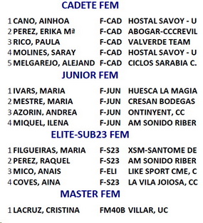 Clasificación PROMESA FEM. 1 WALS CERDA, LUNA BIG BIKES CARLET, CD 2 LOPEZ GARCIA, KENDALL LA FORCA, PC 3 VERDU BALLESTER, HELENA LA VILA JOIOSA, CC